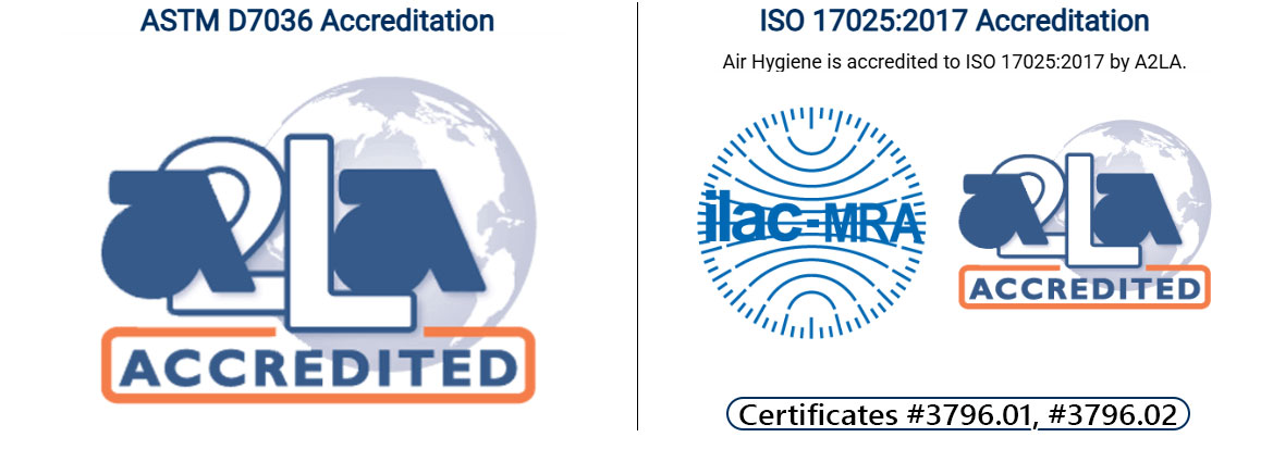 Air Hygiene, as an Air Emission Testing Body (AETB) is accredited to ASTM D7036 (Standard Practice for Competence of Air Emission Testing Bodies) from A2LA and the Stack Testing Accreditation Council (STAC).